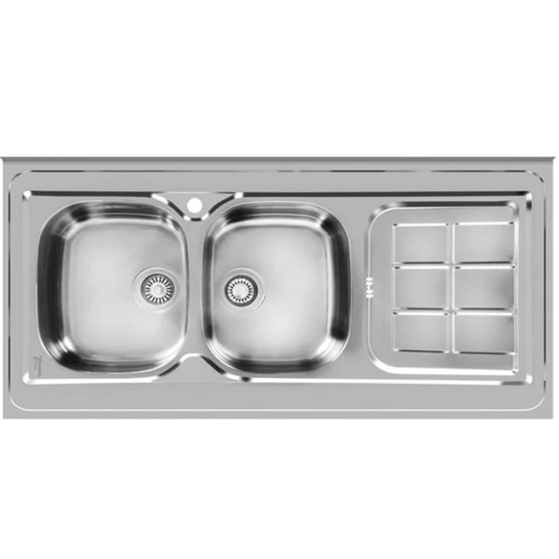 این مدل از ورق استیل ضدزنگ با ضخامت استاندارد ساخته شده که در برابر خوردگی، لکه و خط و خش مقاوم است. طراحی روکار باعث نصب سریع و آسان بر روی کابینت می‌شود و نیازی به ایجاد برش در صفحه کابینت نیست. این سینک دارای دو لگن عمیق برای شست‌وشوی راحت ظروف حجیم و یک سینی پهن و شیب‌دار برای آبگیری بهتر است.