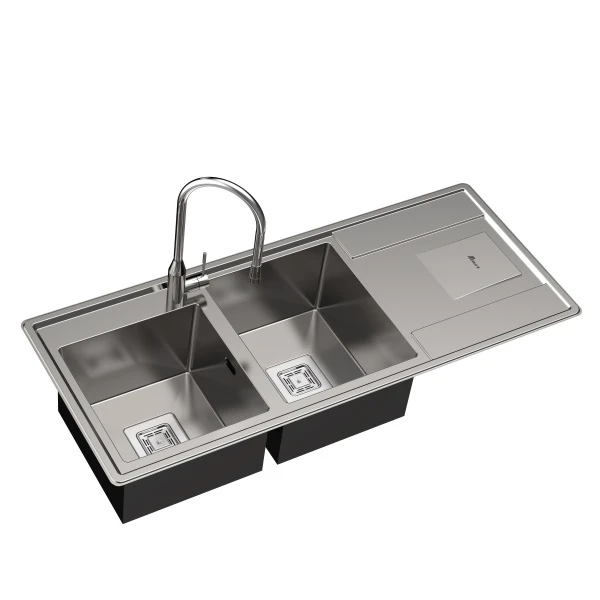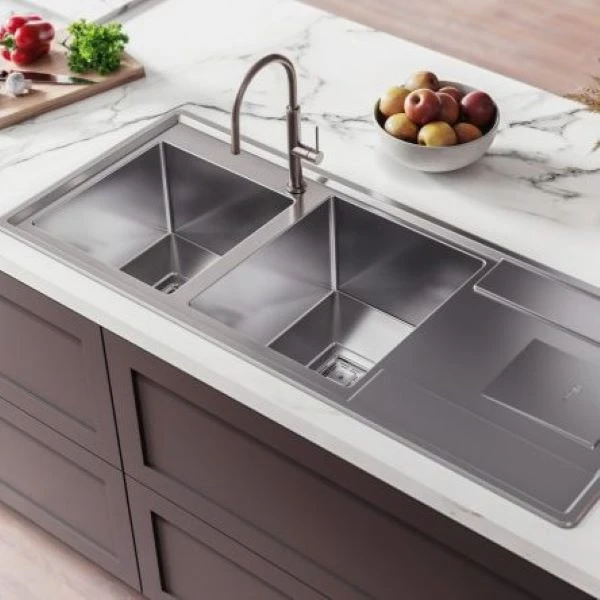 دو لگن این سینک امکان شستشوی همزمان ظروف بزرگ و تفکیک مواد غذایی را فراهم می‌کند. نصب توکار آن باعث می‌شود سطح کانتر مرتب و یکپارچه باقی بماند.