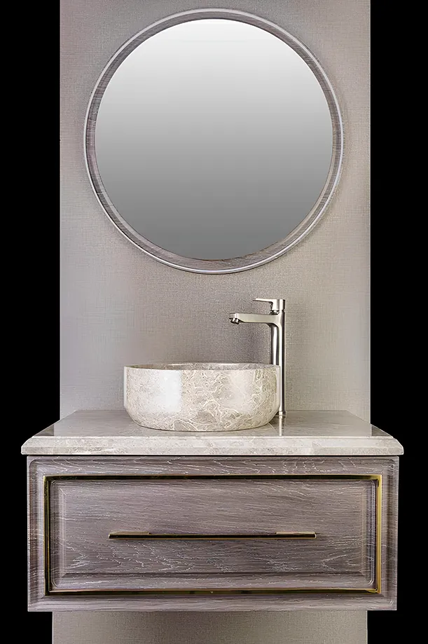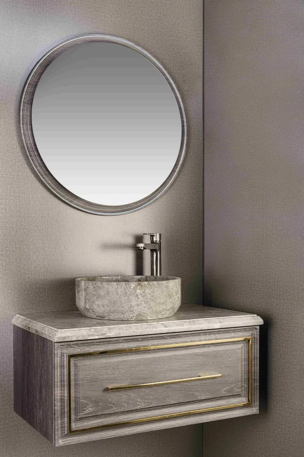 روشویی کابینتی خاکستری دور استیل مدل 43، ترکیبی چشمنواز از سنگ طبیعی لوکس و کاسه استیل ساموین ضدزنگ 304 است که جلوهای مدرن و ماندگار به سرویس بهداشتی شما میبخشد. طراحی منحصربهفرد این محصول با استفاده از فناوری CNC دقیق و نورپردازی LED انجام شده تا فضایی درخشان و مدرن ایجاد کند.