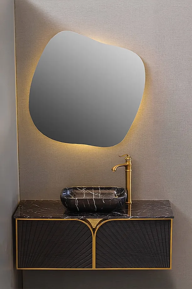 آینه هرمهای LED دار، نورپردازی ملایم و زیبایی متمایزی ایجاد میکند و صفحه سنگ طبیعی با کیفیت، دوام بالا و مقاومت در برابر رطوبت و ضربه را تضمین میکند. فریم استیل ضد زنگ و یراقآلات برند فانتونی، محصولی با ظرافت و طول عمر بالا ارائه میدهد.