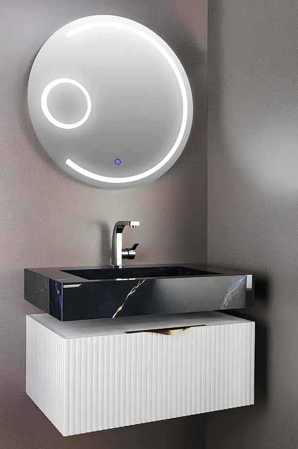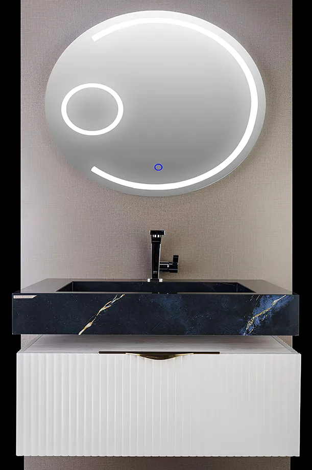ویژگی منحصربه‌فرد این مدل، آینه تاچ LED سندبلاست با قابلیت زوم 5 برابری (5x) است که دیدی واضح و دقیق برای آرایش یا اصلاح فراهم می‌کند. جزئیات CNC ظریف روی درب‌ها، جلوه‌ای لوکس و چشم‌نواز به طراحی کلی کابینت می‌بخشد.