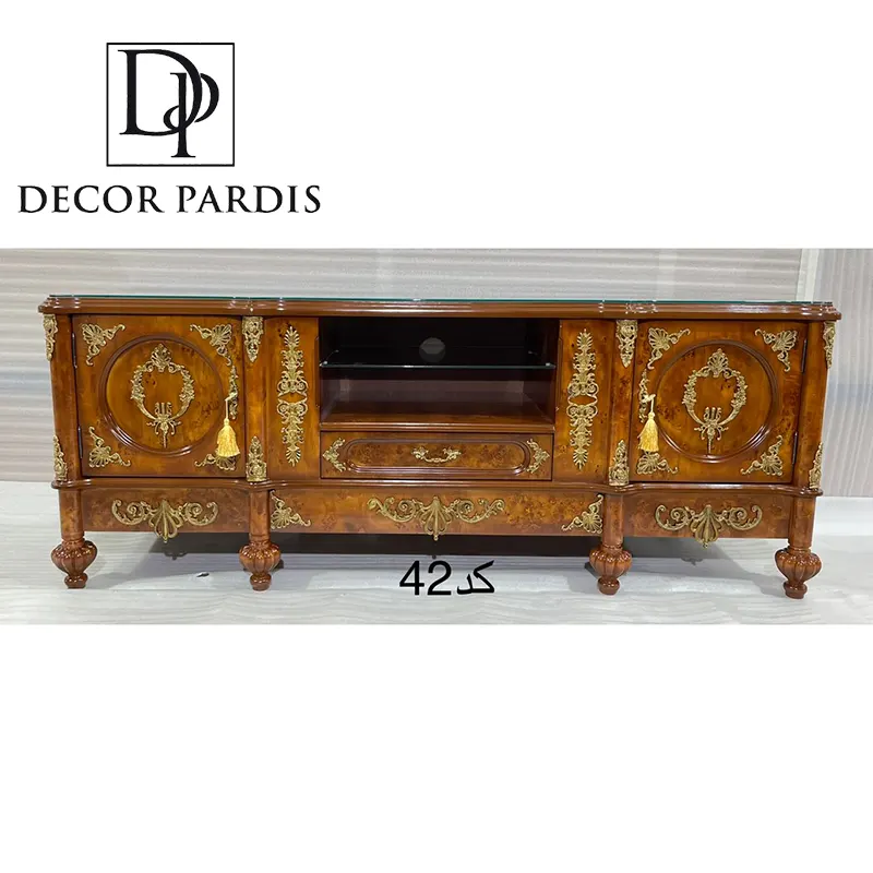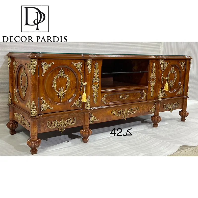 ارتقای ارزش دکوراسیونی: این میز تلویزیون منبت کاری شده با طراحی هنری خود، به عنوان نقطه کانونی دکوراسیون پذیرایی شما عمل میکند